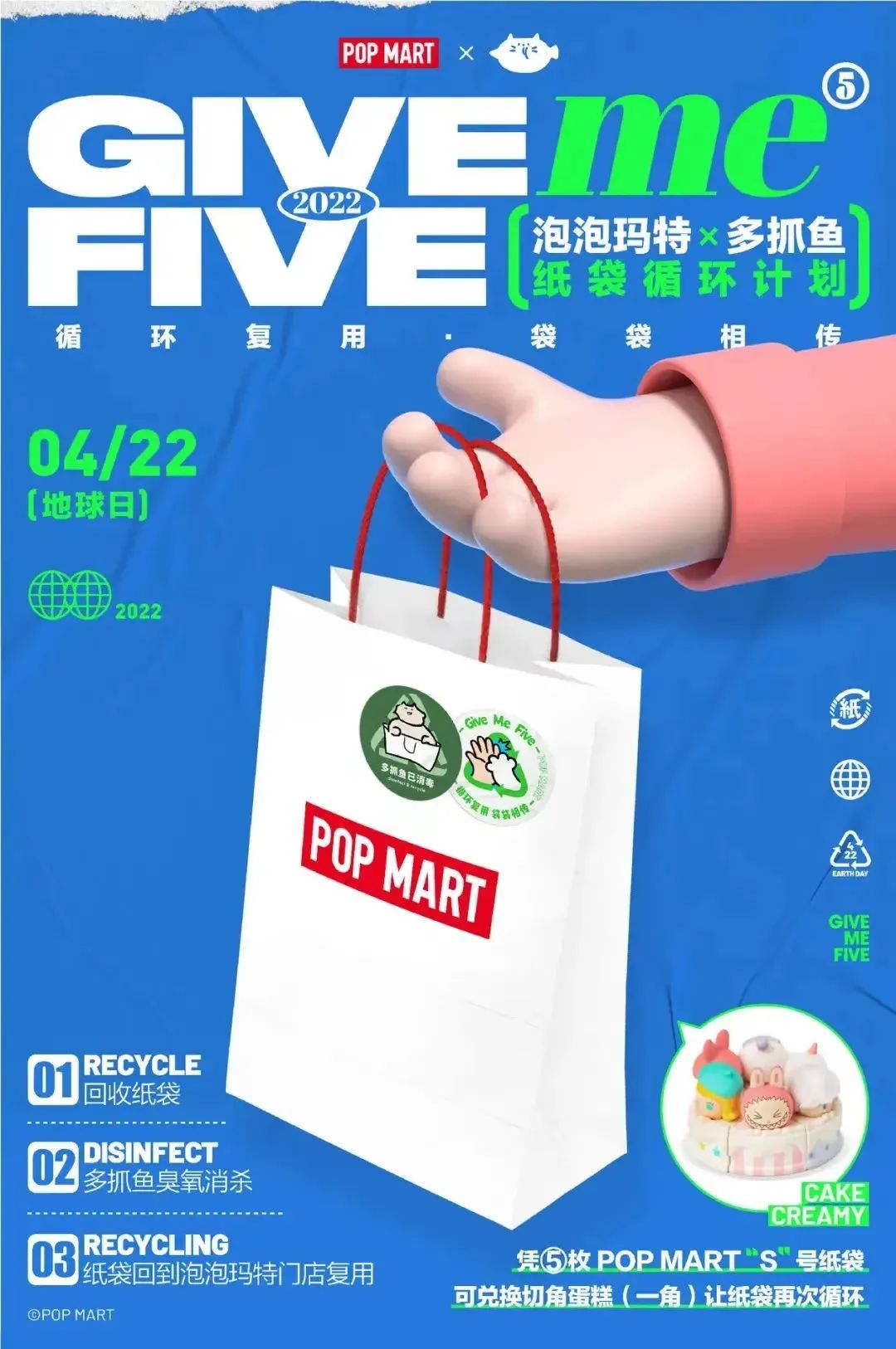 泡泡玛特牵手二手循环服务品牌多抓鱼,上线「纸袋循环计划」。消费者凭借5枚泡泡玛特S号纸袋,即可在指定门店兑换一块蛋糕。