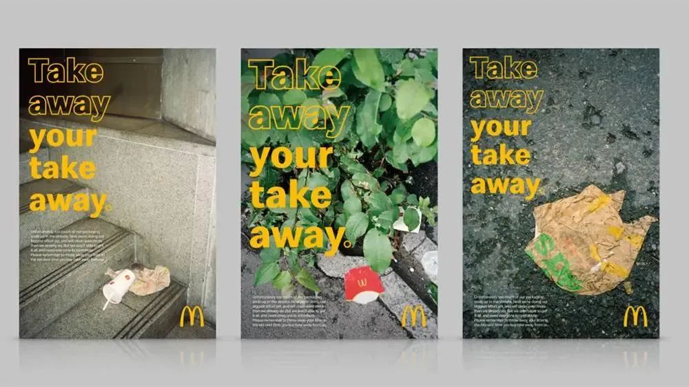 不过麦当劳却想到了“用魔法打败魔法”的方式,直接用外卖垃圾拍宣传海报。宣传标语也很精妙:take away your take away,其中“take away ”兼具“外卖”和“带走”两个意思,一语双关,好记又让人眼前一亮。