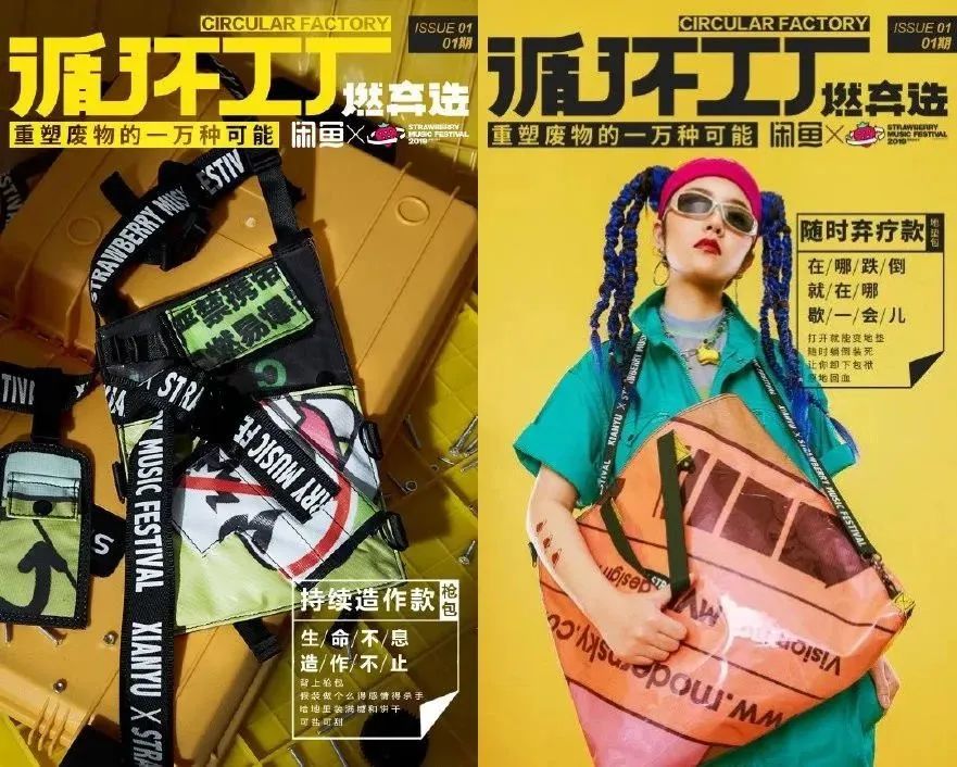在自身赛道里不断钻研,挖掘出藏在垃圾中的宝藏,闲鱼在这一点上,可以说是经验丰富的“行家”,跨界摩登天空的草莓音乐节,发布「燃、弃、造」系列潮流单品,并打造出“循环工厂”的设计理念。闲鱼将音乐节结束后散落在地上的废弃物品回收,再通过设计师们的“换头”改造,那些被遗弃的垃圾就变成限量款背包。