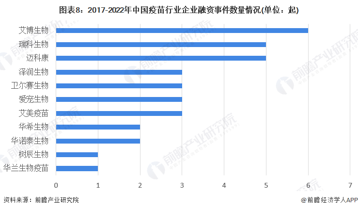 从疫苗行业企业融资事件数量情况来看,2017-2022年,艾博生物融资次数较多,共发生6起,其次是瑞科生物和迈科康,融资次数均为3起。