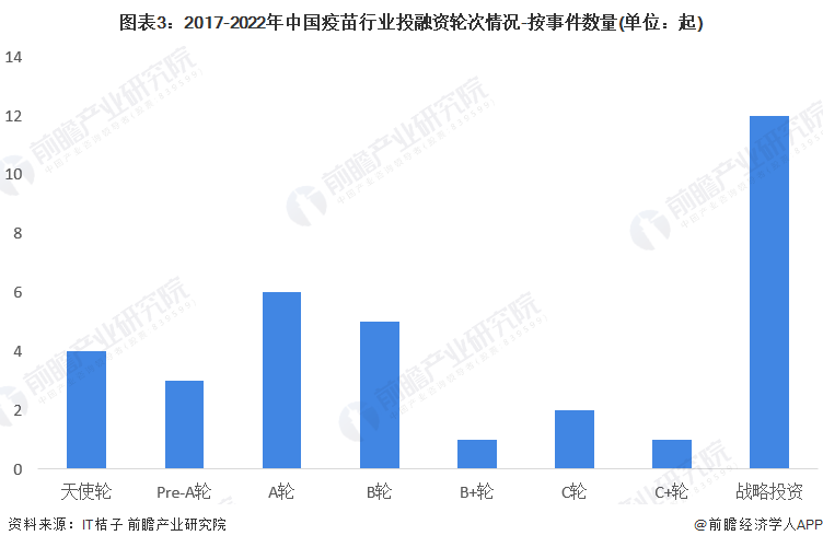 从疫苗行业的投资轮次分析,2017-2022年,中国疫苗行业投资以早期投资和战略投资为主,战略投资事件共发生12起、A轮投资事件共发生6起,二者合计占总投融资事件的比重为52.94%。