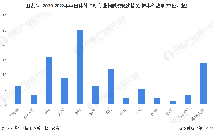 从体外诊断行业的投资轮次分析,2020-2022年,体外诊断行业投资以早期投资和战略投资为主,B轮投资事件共发生25起,A轮投资事件共发生16起,战略投资共发生14,三者合计占总投融资事件的比重为52.88%。
