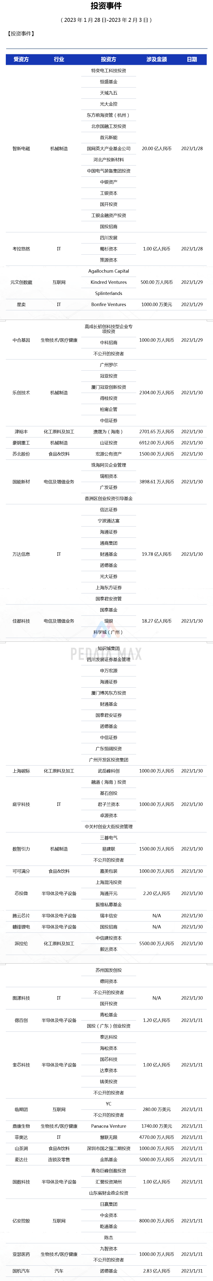 本周涉及金额较大的投资事件是:2023年2月3日,烟台国丰投资控股集团有限公司、大成基金管理有限公司、财通基金管理有限公司、工银瑞信基金管理有限公司、国泰君安证券股份有限公司等投资烟台泰和新材料股份有限公司29.87亿人民币。烟台泰和新材料股份有限公司是一家化纤产品制造商,主要产品有氨纶、间位芳纶、对位芳纶等相关产品,拥有“纽士达”“泰美达”“泰普龙”等产品品牌,广泛应用于弹力服饰、电气绝缘、环境保护、先进制造业等领域。