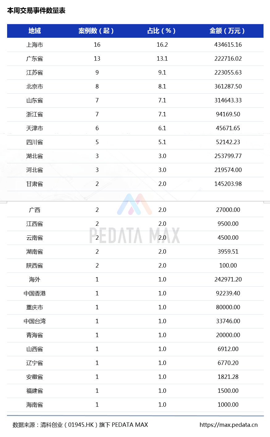 PEDATA MAX数据周报:本周投资、上市和并购共99起事件,涉及总金额289.89亿元人民币