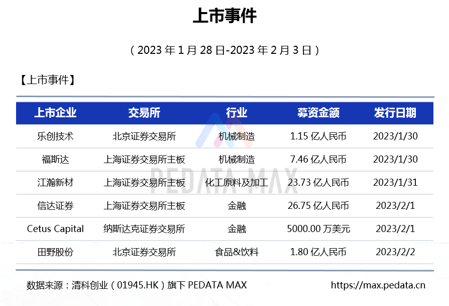 清科创业(01945.HK)旗下PEDATA MAX 统计:截至本周五下午,本周有6家企业上市,总融资金额64.27亿人民币。