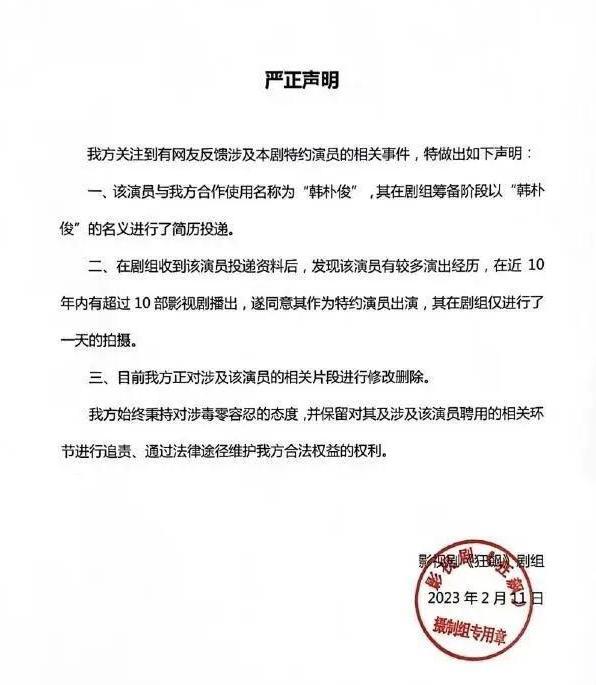 钟阿四剧照2月11日晚,《狂飙》在其官方微博发布官方声明称,演员韩朴俊通过简历投递途径参与剧集拍摄,过往有十余部作品的演艺经验,作为特约演员仅拍摄一天。目前剧方对涉及该演员相关片段进行修改删除,对涉毒艺人保持零容忍态度,且保留对演员及聘用相关环节的法律追责权利。