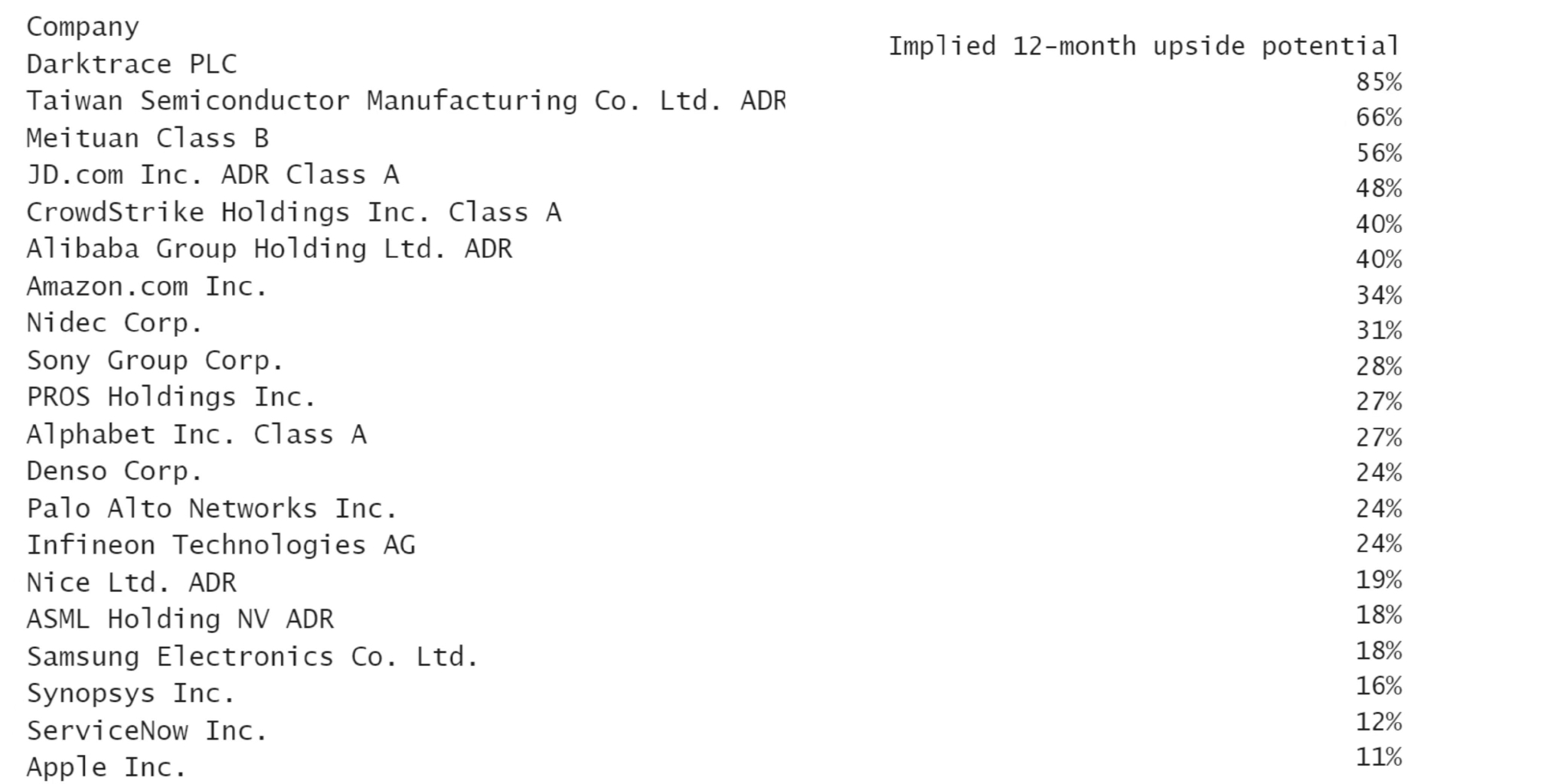 在这88家公司中,有30家被至少75%的分析师评为“买入”。在这份名单中,根据分析师们所预测的未来12个月的上涨潜力,列出了如下20只最值得推荐的AI股票: