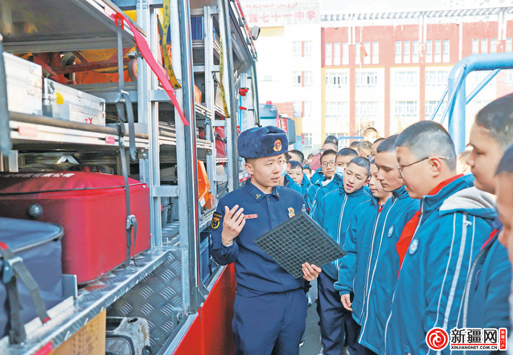 在市第71中学,乌鲁木齐晚报社(乌鲁木齐晚报集团)驻沙依巴克区雅山街道校园社区工作队邀请市消防救援支队沙依巴克区大队和田街消防救援站走进校园,为学生上一堂消防知识课、开展一次消防演练、邀请学生体验一次消防设备操作。