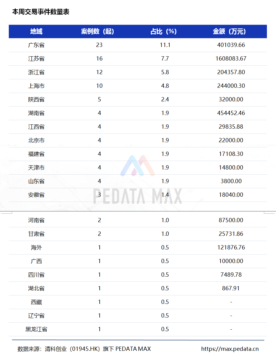 清科创业(01945.HK)旗下PEDATA MAX 统计:截至本周五下午,投资、上市和并购共104起事件,涉及总金额330.30亿人民币。2023年2月8日,南方基金管理股份有限公司、瑞士银行集团、广发基金管理有限公司、诺德基金管理有限公司、财通基金管理有限公司等投资上海派能能源科技股份有限公司50.00亿人民币。从交易事件地域分布看,目前主要分布在广东省、江苏省和浙江省,占比为广东省11.1%,江苏省7.7%,浙江省5.8%。