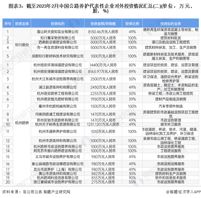 注:上述汇总截至2023年2月。从几家代表性企业的对外投资来看,山东路桥的对外投资主要为了布局下游、多样化业务布局;杭州路桥对外投资的目的则是布局上游、下游和多样化业务。整体来看,