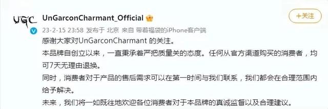 事发后,网上的舆论越演越烈,品牌在当天发布声明,称可以七天无理由退还。