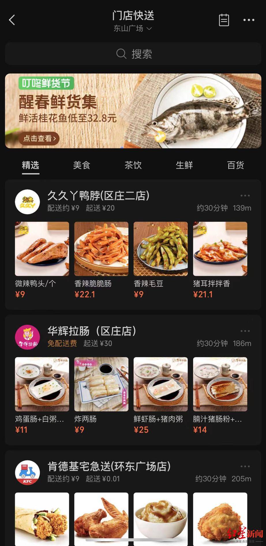 红星新闻记者在成都体验了抖音下单。打开抖音App后,记者点击所在城市频道,看到附近美食选项,进入后点击“可外卖”,筛选出可以送外卖的商家。