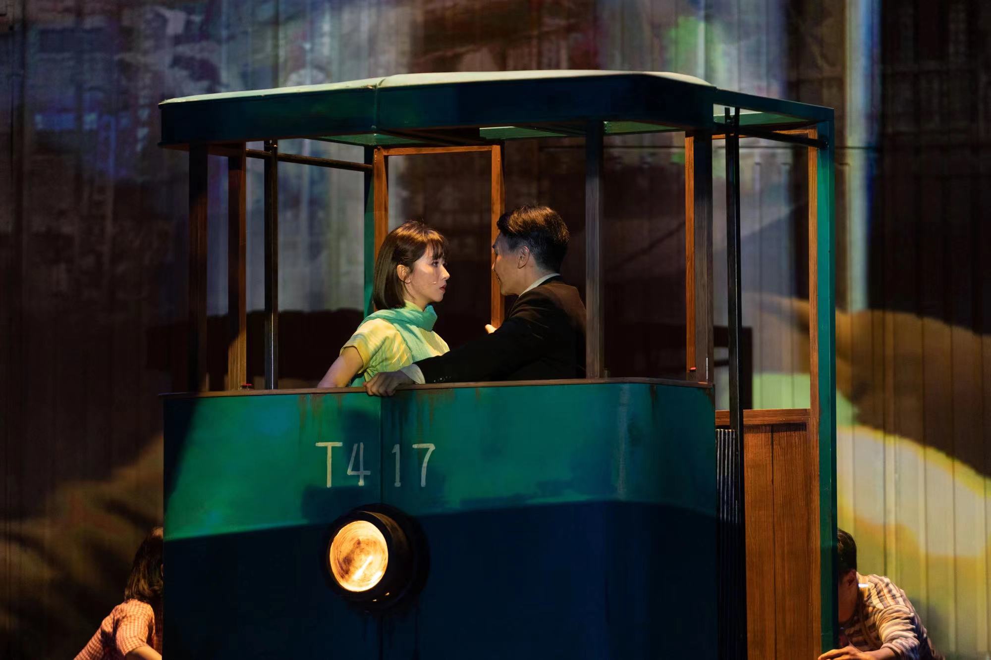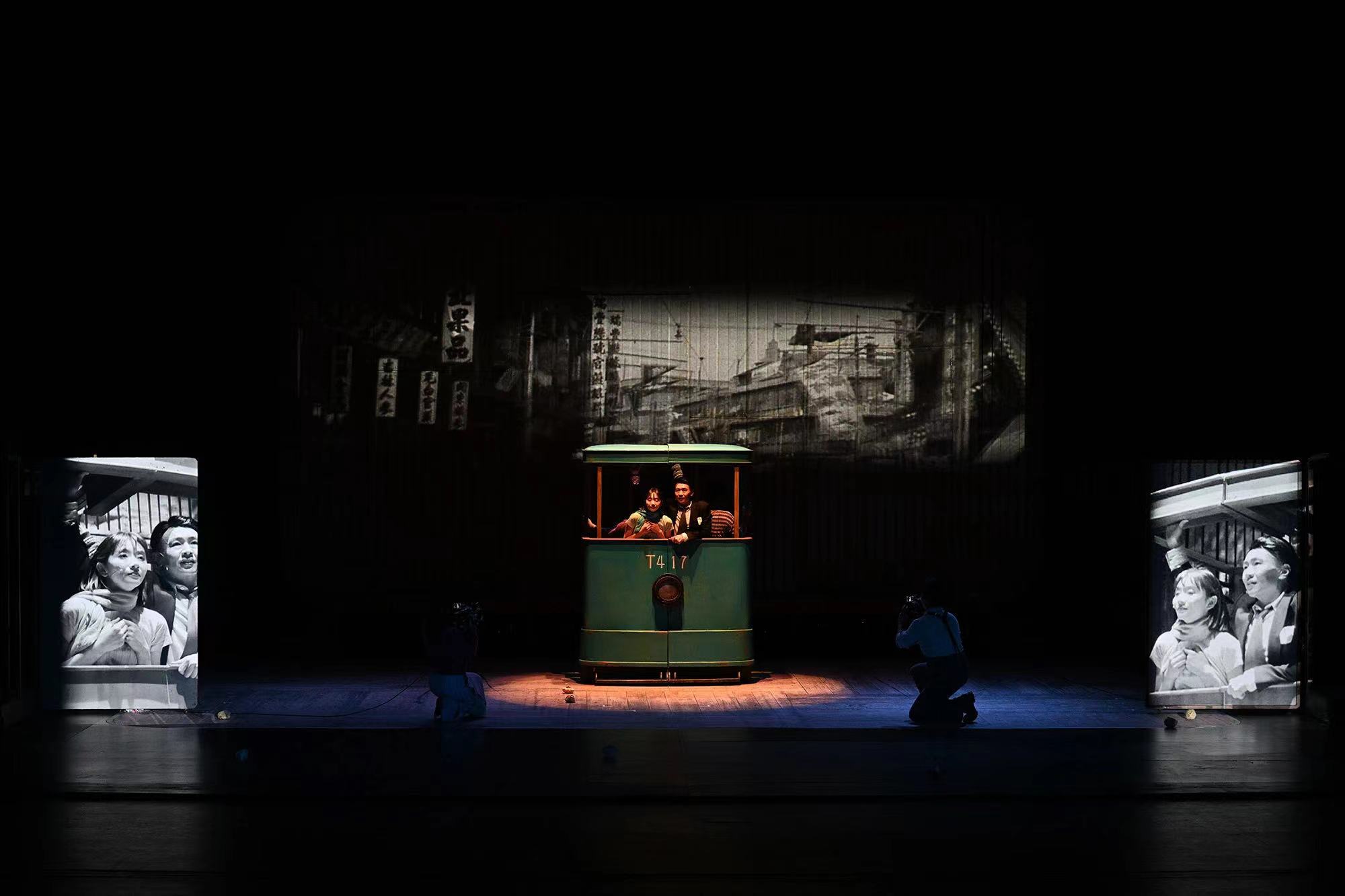 ▲话剧《十字街头》过往剧照。戏剧是时空的艺术,如何联动经典老电影和戏剧艺术,话剧《十字街头》给出了极具新意的答案。话剧《十字街头》拆解了电影的叙事逻辑,舞台底幕承担了投影幕布的作用,老电影的影像投射其上,或是黄浦江岸,或是民国街景,演员甚至可以穿进穿出。舞台上,演员会身兼摄像工作,实时拍摄正在表演的片段,包括表情特写和动作细节。“我做了几种方案和尝试,最终我认为做老电影改编的时候需要转变思路,就是我们不仅仅是在一个空间当中由真人演出这么简单,我应该把这个空间和所有表演的内容当作素材,把舞台当做一个剪辑台。”黄盈表示。这并不是他第一次在作品中运用舞台上的“蒙太奇”,早在2011年的作品《都》中就初见雏形,之后的《花事如期》《梦行者》中都可见到此种尝试。此外,话剧《十字街头》的重要道具铛铛车也令不少观众印象深刻,在老上海灰白色的旧影像中,形形色色的人上车下车,这抹“绿色”成为了充满时代感的视觉符号。可拆分可滑动的设计使之化身不同的空间,它是老赵和杨小姐邂逅的电车,也是“一墙之隔”的出租房。
