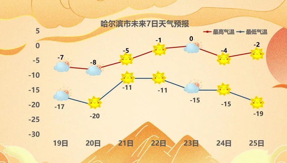 【气温】气温略有波动,19-20日夜间最低气温-19℃左右,白天最高气温-7℃左右,21日气温明显回升,夜间最低气温升至-11℃左右。气温波动频繁,保暖仍是重点。