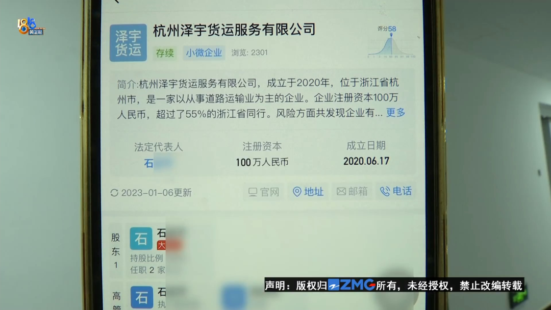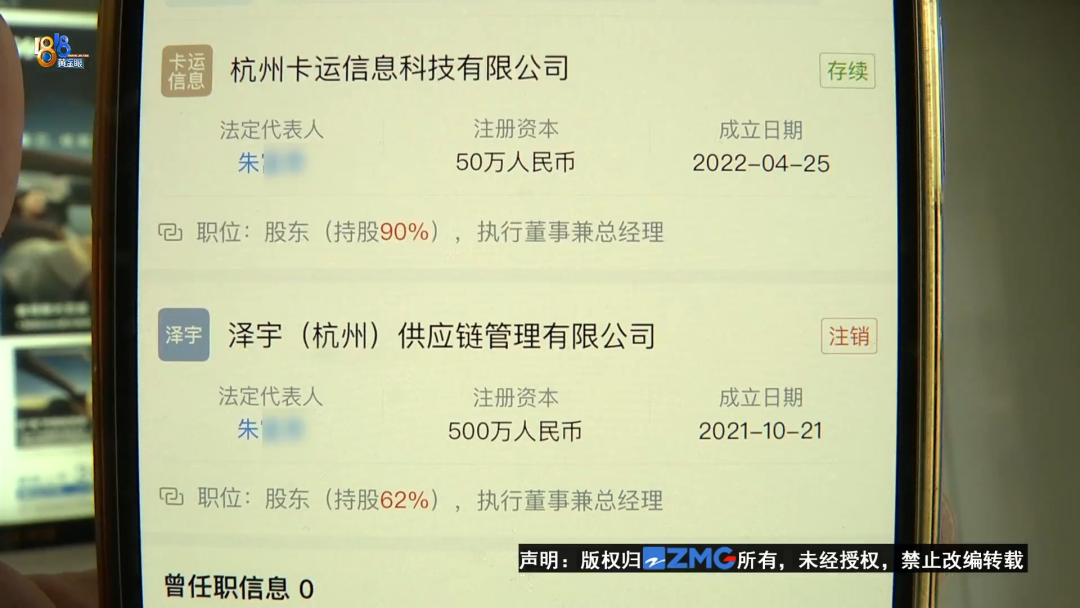 采访时,杭州卡运信息科技有限公司的王总经理赶了过来,也就是新闻开头的那一位。企业信息查询软件显示,杭州卡运信息科技有限公司地址位于这栋楼的1415号房间,法定代表人姓朱,和一家已经注销的“泽宇(杭州)供应链管理有限公司”法定代表人名字相同。这家“泽宇供应链公司”的股东中有一位石总,和“泽宇货运”的法定代表人同名。对此,王总经理回应,“卡运”和“泽宇货运”没有关系。