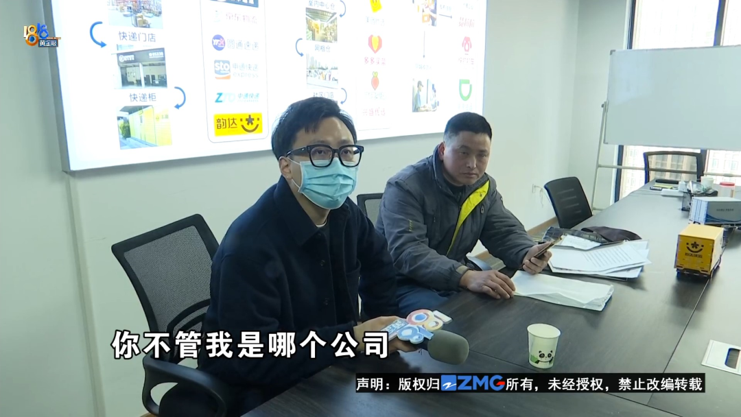 一间办公室,怎么有两家公司的名称呢?这个1416号房间,和赵师傅协议上“泽宇货运”的地址一致。根据企业信息查询软件显示,杭州泽宇货运服务有限公司的地址就在这里。现场一位女子表示联系了负责人,并将赵师傅和记者带到了隔壁1415号房间里的会议室。随后,刚刚表示自己不属于两家公司的高先生进来了,还“热情”地和记者交谈起来。