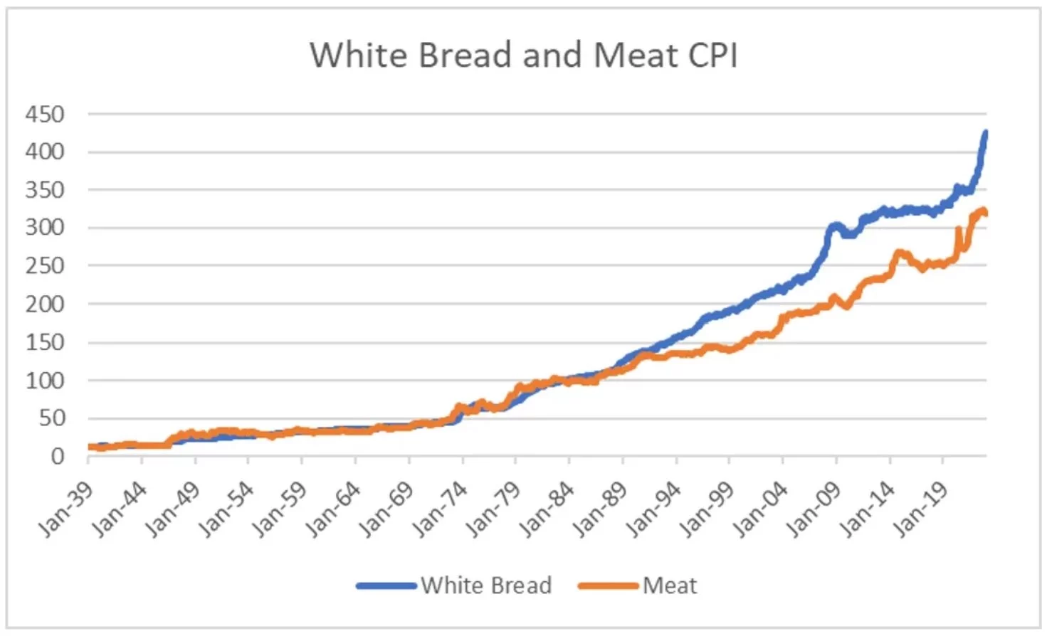 文章指出,真正喜欢食品通胀的地方在于它具有普遍性且易于理解。对大多数人来说,价格高出30%的柏金包或沛纳海并不是通货膨胀。但是面包和肉的价格呢?这对每个人都很重要。美国CPI数据的真正优点在于,它将白面包和肉类CPI细分回二战前。白面包CPI同比涨幅仍接近20%,而肉类CPI同比涨幅回到2%。