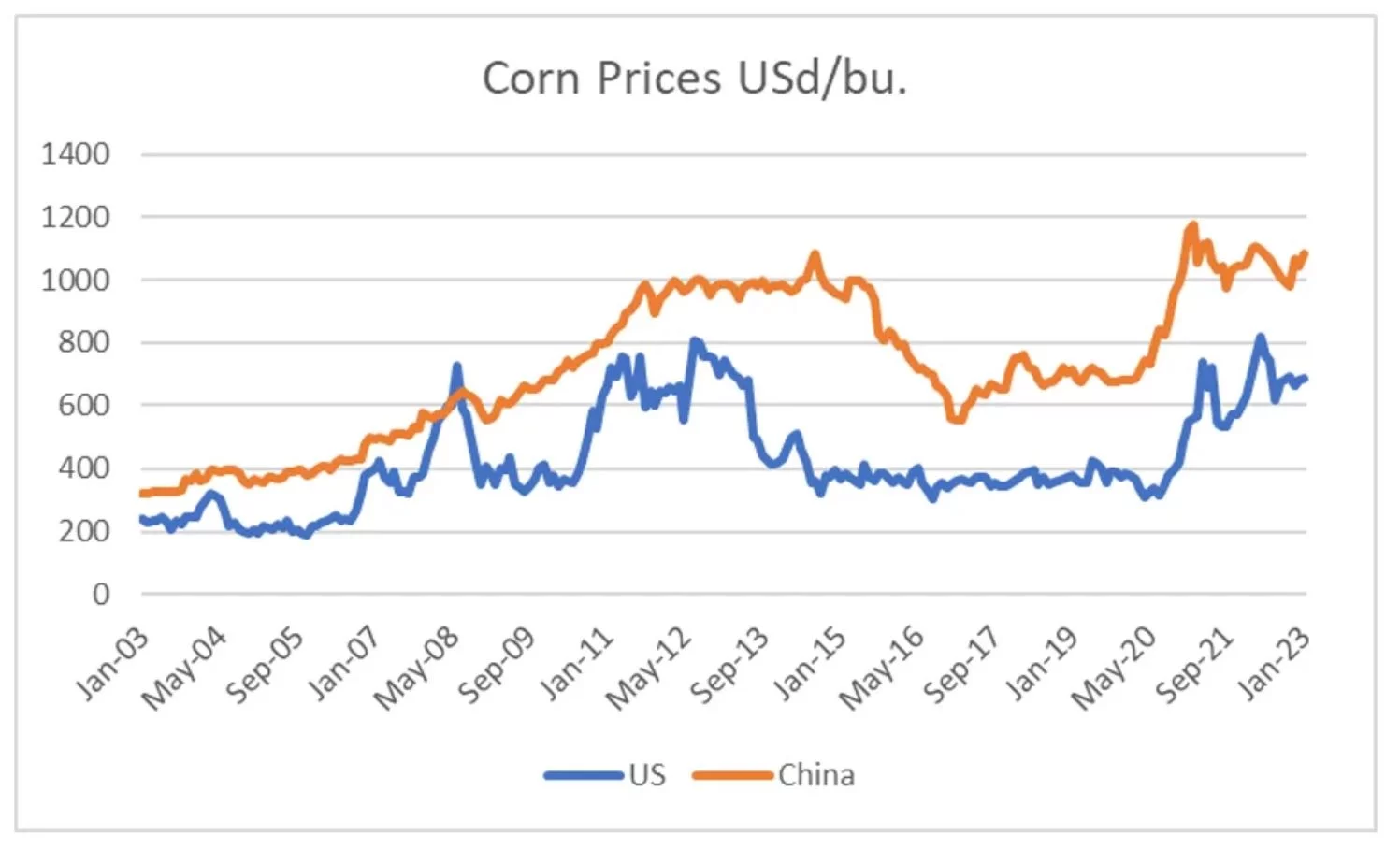 中国对玉米进口征收关税,这意味着中国玉米价格远高于美国价格。