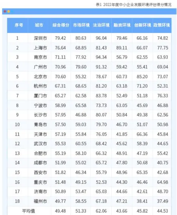 2月21日,第二届全国中小企业发展环境论坛在深圳举办,会上发布《2022年度中小企业发展环境评估报告》,深圳以79.42的综合得分排名全国第一;去年得分为77.83,同比增长2%;上海、南京、广州、北京、杭州、厦门、宁波、长沙和青岛紧随其后,位列全国前十。
