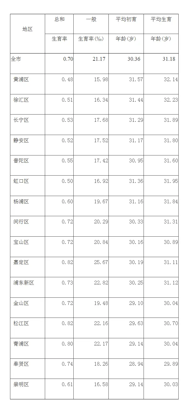 此外,上述数据还显示户籍人口生育率与生育年龄情况。数据显示,全市总和生育率为0.7。平均初育年龄为30.36岁,平均生育年龄为31.18岁。