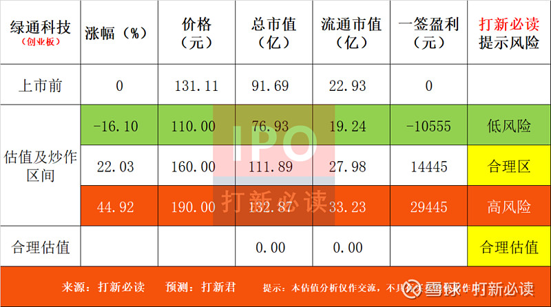 预测表格说明:黄色为打新君预测的开板价格和天数,绿色为低风险区间,红色为高风险区间。在过去的几年里,根据统计数据正确率在72-78%区间,统计口径为开板价格±20%。科创板合理、高、低风险区间表示前五天可能面临的价格,其中低风险区预示价值凸显,高风险区间为炒作风险区间。$绿通科技(SZ301322)$