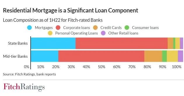 如果提前还贷潮继续演进,住房贷款余额持续收缩,银行面临的盈利压力和资产配置压力将进一步上升。惠誉预计,受基础设施、小微企业贷款及绿色贷款持续增长的拉动,2023年银行贷款规模将实现11%的增幅。但是住房按揭贷款需求在购房者信心大幅提振之前,可能将难以显著回暖。2022年底,房贷在中资银行全部贷款中占比为18%,其贷款价值比介于40%-60%的中等区间,且减值风险很低。