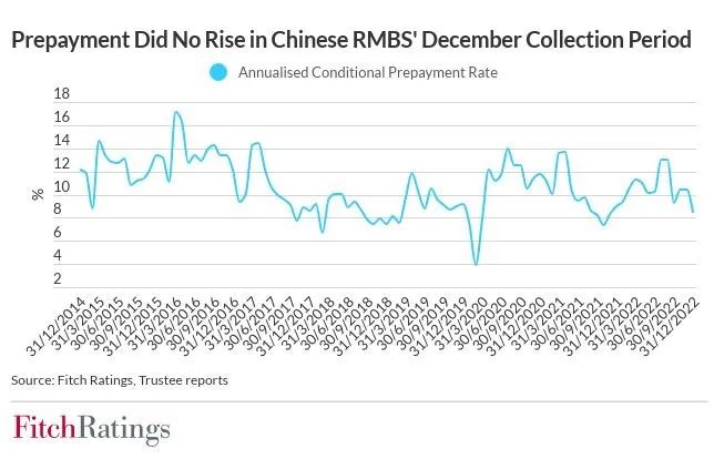 中国存续RMBS交易的年化早偿率历史平均水平约为10%-12%,在2022年12月的最新回收期内并未出现上升,这可能是由于房产交易量疲软使全额提前还贷的改善型购房者数量下降。