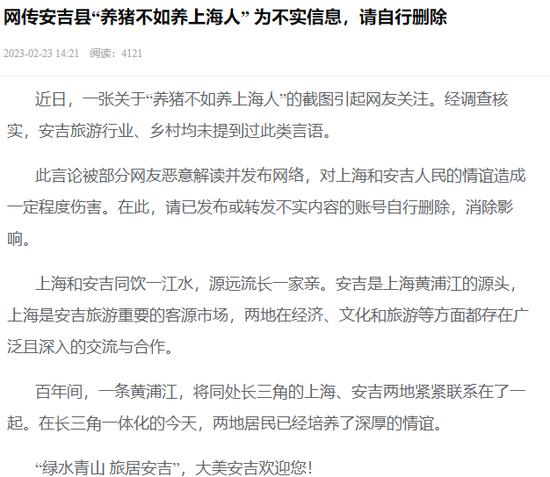 据潮新闻,2月23日下午,安吉县委宣传部回应记者,经调查核实,安吉旅游行业、乡村等相关从业者均未提到过此类言语。该言论为三农问题专家首提,随后此言论被部分网友恶意解读并发布网络,已对上海和安吉人民的情谊造成一定程度伤害。请已发布或转发不实内容的账号自行删除,消除影响。