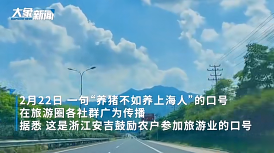 据大象新闻百家号2月23日发布视频称,近日,浙江安吉县鼓励农户从事旅游行业的口号“养猪不如养上海人”在旅游圈广为传播,粗看有点“辱沪”,实则道破了国内江浙沪一带多年来的旅游业天机,毕竟要有身价才值得“养”。