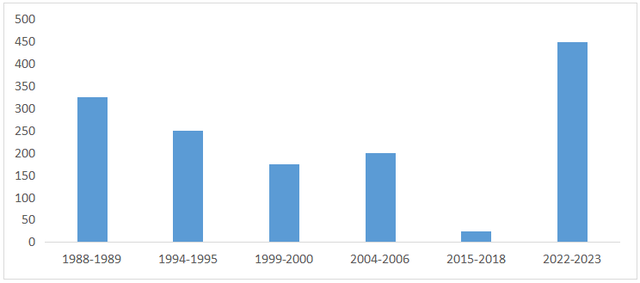 图2:近40年来美联储各加息周期中前12个月利率上升幅度(bp)