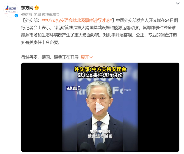 2月24日,据东方网报道,中国外交部发言人汪文斌在24日例行记者会上表示,“北溪”管线是重大跨国基础设施和能源运输动脉,其爆炸事件对全球能源市场和生态环境都产生了重大负面影响。对此事开展客观、公正、专业的调查并追究有关责任十分必要。