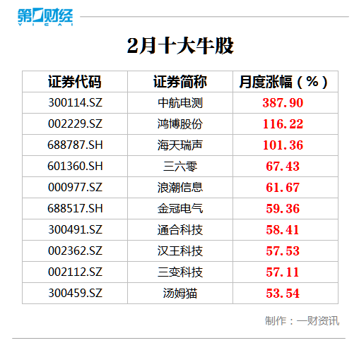 在剔除最近半年上市的新股后,截至2月24日收盘,2月份十大牛股平均涨幅较上个月明显扩大,其中3只牛股涨幅超过100%,榜首的中航电测更是大涨近4倍。