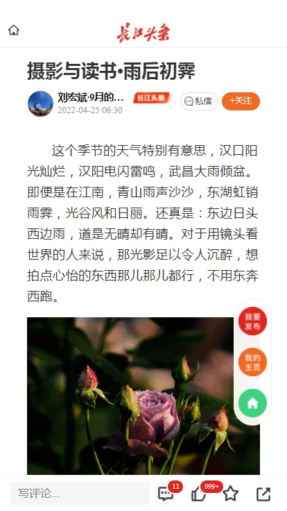 刘宏斌发布在“长江头条”上的随笔与摄影作品之后,刘宏斌在“长江头条”上分享自己的摄影作品以及散文随笔,高质量的图文引得网友纷纷点赞。在刘宏斌的作品下,“词美图美,美美其美!”“好作品,令人感动”……网友们发自内心的赞赏常常可见。至今,刘宏斌已在长江头条上发布了119个作品,阅读量达1223万,获得33.8万点赞。刘宏斌表示,在“长江头条”这个平台,可以袒露心声,也能借由这里彰显武汉人的当下生活。“我会更加努力,借助长江头条抒发情怀,赞美新时代,憧憬美好的未来……”刘宏斌在获奖后说。