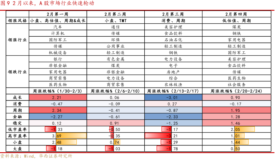 2月以来,A股市场呈现行业、风格快速轮动的特征。A股领涨板块从AI、智能识别等主题概念,到酒店餐饮等可选消费,医药、食品饮料等必选消费,再到煤炭、钢铁等周期行业,几乎所有的板块都有过阶段性的上涨,但持续性并不强。其主要原因: