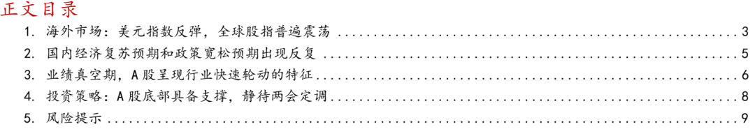 近期A股调整的三大因素:1)美联储的加息路径预期继续调整,美元指数和美债收益率持续反弹,使得全球权益市场波动率抬升;2)热点城市房地产市场回暖下,市场对政策宽松的预期出现反复;3)地缘事件影响。我们判断市场底部区间仍具备支撑,阶段性调整即是再次布局的机会。其一,随着2022年加息延迟效应的显现,美国经济增速将放缓,美元指数上行空间或有限;其二,国内恢复基础尚不牢固,在出口增速面临回落压力的背景下,货币政策还没有到收紧的阶段。3月A股将迎来两会时间,随着政策预期落地、1/2月经济数据和企业财报的陆续披露,A股将从板块快速轮动回到结构性行情中。