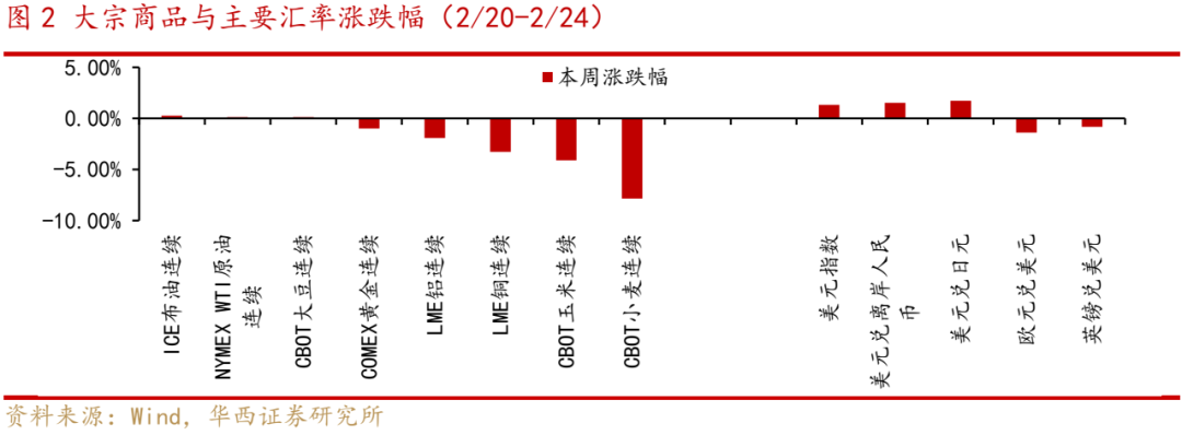 一、海外市场:美元指数反弹,全球股指普遍震荡。1月美国通胀数据回落不及市场预期,且美国经济活动表现也好于预期,投资者对美联储的加息路径预期继续调整,美元指数和美债收益率持续反弹,使得全球权益市场波动率抬升。鉴于当前美国经济显示出的韧性,美联储可能将政策利率在周期高位维持一段时间,年内降息概率在降低。随着2022年加息延迟效应的显现,美国经济增速将放缓,美元指数上行空间或有限。随着国内经济的进一步复苏,人民币汇率将转为双向波动。