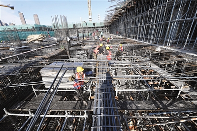2月24日,北京城市副中心站综合交通枢纽的建设现场内,塔吊搬运着钢筋等建材,工人们分散在各处加紧施工。