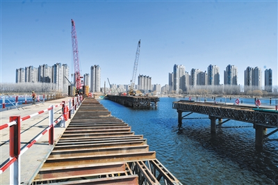 在京冀两地间,潮白河上又将有一座地标性的桥梁建成——厂通路潮白河大桥。2月24日,在大桥的建设现场,记者看到,横跨潮白河两岸的工程建设用桥即将全部建成,建设方正在为桥梁桩基施工做最后的准备,相隔不远的对岸就是人口密集的北三县。“大桥的设计十分有特点,三孔桥从侧面看类似舵轮,寓意起航。”中交路桥建设有限公司项目书记唐宏说,届时这座大桥将成为潮白河上的又一新地标。