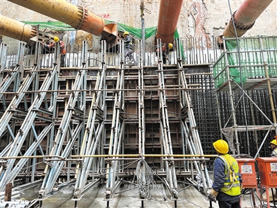 在工地的中心部分,有一片建设进度较快的工程区域,这里是未来车站的核心区域。目前,车站主体结构施工已进入地下一层顶板的结构施工,地下车站已在地面“露头”,整体的钢结构轮廓正慢慢展现出来。在地上,还将建设标志性建筑——“京帆”屋盖,打造檐下绿色城市会客厅,每年可减少照明用电约48.6万度。
