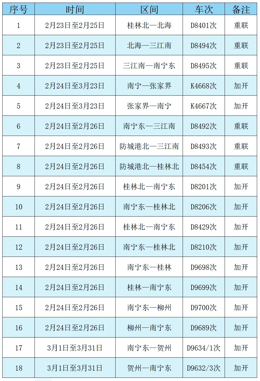 广西新闻网-南国今报柳州讯(记者 黄远来 通讯员 赵波)2023年春运结束后,广西旅游客流热度不减,柳州火车站自2月23日至3月31日加开或重联18趟热门方向列车,全力满足旅客出行需求。