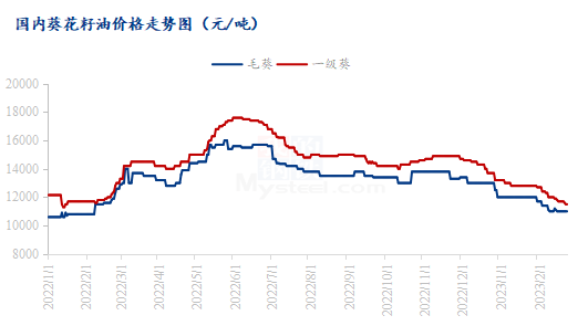国内一级葵花籽油市场周初偏弱运行后趋于稳定,市场报价11300-11800元/吨,较上周11500-12000元/吨,下调300元/吨,跌幅2.54%;葵花籽毛油市场报价10900-11000元/吨,较上周10900-11000元/吨,无涨跌;俄罗斯葵花籽毛油3月末4月初到货CIF报价1350美金/吨。远期看弱情绪较浓,报价较低,刺激现货价格持续走低。