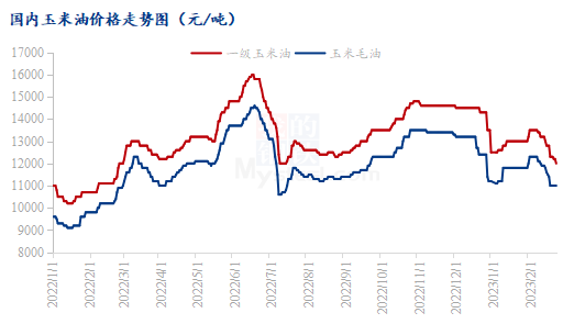 国内玉米油市场需求偏弱,胚芽价格持续回落,带动玉米油市场行情下行,下游拿货不积极,国内一级玉米油市场报价12000元/吨,较上周12800元/吨,下调800元/吨,跌幅6.25%;玉米毛油市场报价10800-11000元/吨,较上周11400-11500元/吨下调500元/吨,跌幅4.35%。