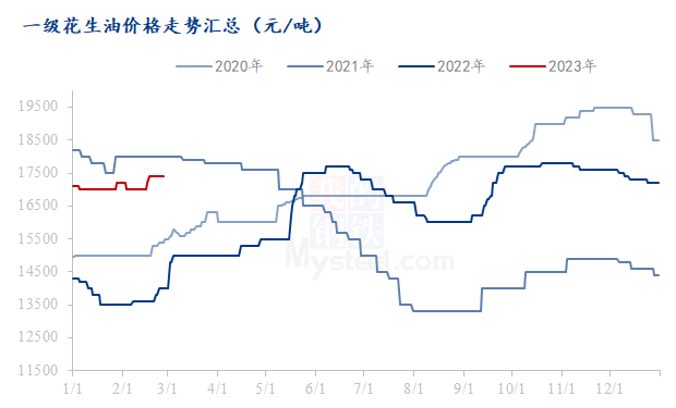 行情预测:后市来看,短期受原料支撑下花生油出厂价格有望继续走高,而进入三四月份花生油市场将进入传统淡季,在宏观偏弱以及油脂供应预期增加的抑制下,或将限制花生油向上突破动力。