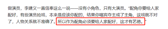 李建义专注于自己的角色,在他看来,是配角就不能抢戏,不能演成主角,这是艺德。