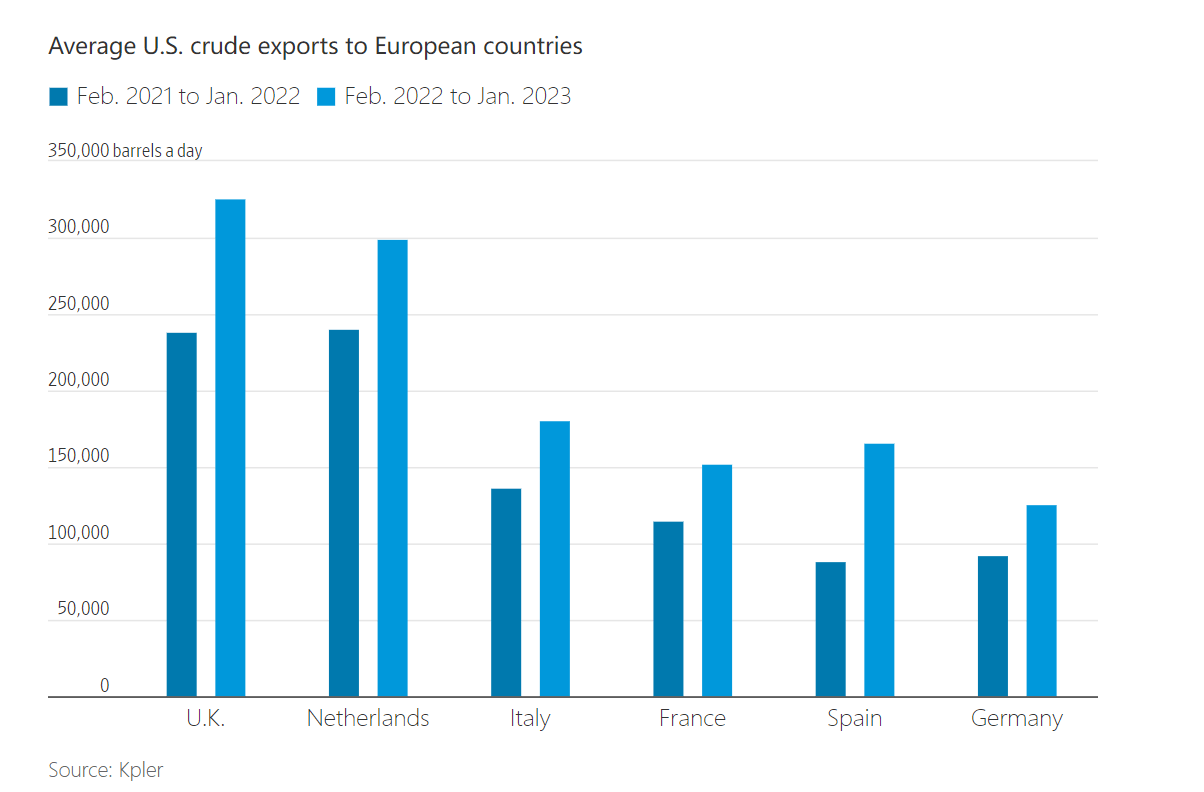 从能源市场的角度来看,由于俄罗斯让出了欧盟大部分市场,美国正“趁虚而入”,据白宫的数据,去年美国对欧天然气出口量增加了一倍多,另外,美国原油产量激增也有助于稳定欧洲市场。