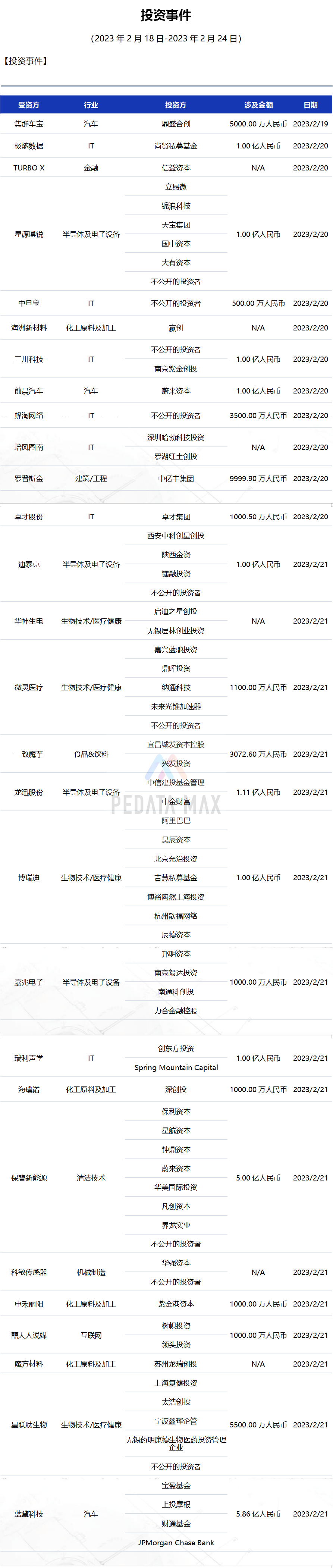 本周涉及金额较大的投资事件是:2023年2月21日,安徽江东产业投资集团有限公司、国泰君安资产管理(亚洲)有限公司、诺德基金管理有限公司、兴证全球基金管理有限公司、马鞍山固信增动能股权投资基金合伙企业(有限合伙)等投资蓝黛科技集团股份有限公司5.86亿人民币。蓝黛传动是一家乘用车变速器及零部件研销商,司主营业务是乘用车变速器齿轮及壳体等零部件、变速器总成、摩托车主副轴组件的研发、生产与销售,产品主要应用于主机市场。