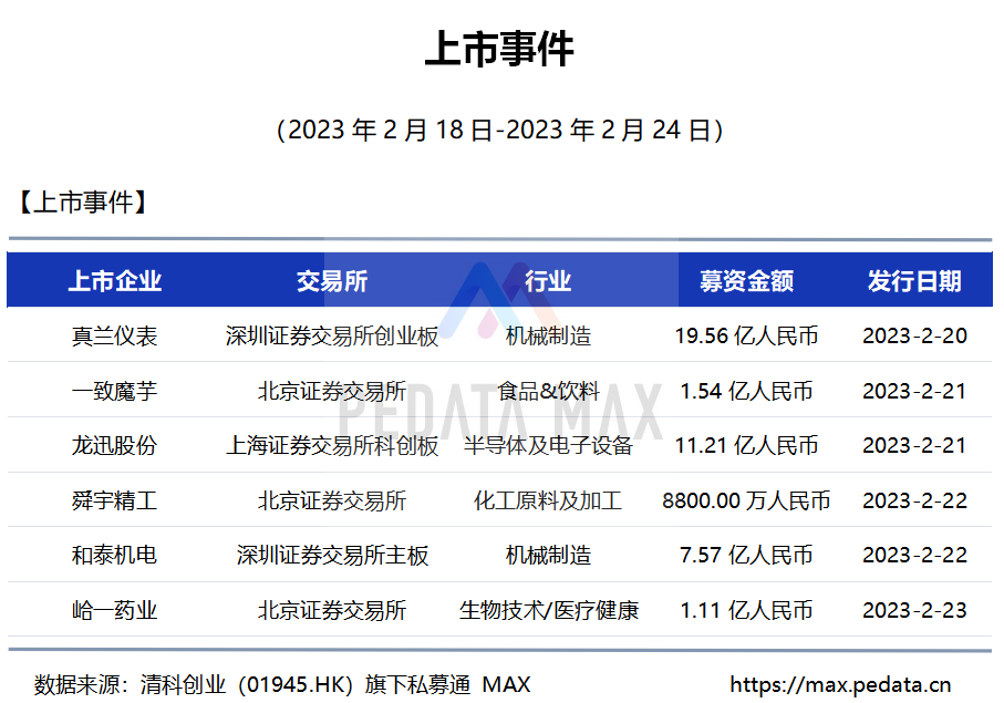 本周融资金额较大的上市事件为:2023年2月20日,真兰仪表在深圳证券交易所创业板成功挂牌上市。真兰仪表公开发行股票7300万股,发行价格为26.8元/股,总募集金额为19.564亿人民币。真兰仪表本次IPO募资资金将用于真兰仪表科技有限公司燃气表产能扩建项目、上海真兰仪表科技股份有限公司基地建设项目(上海计量仪表建设项目、上海研发中心建设项目)和补充流动资金。真兰仪表成立于2017年12月,是一家仪器仪表制造商。业务涵盖仪器仪表、燃气设备、电子设备及电子元器件、公共安全防范设备、仪表及零部件研发、制造、加工、销售、安装、维修及相关技术服务、技术咨询、技术成果转让等。