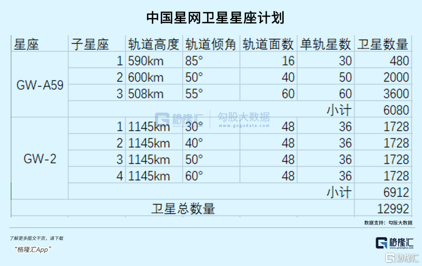 2020年9月,一家代号为“GW”的中国公司(国网的拼音首字母,即“中国星网”成立之前的暂定名称),向国际电信联盟递交频谱分配档案。档案中曝光了两个名为GW-A59和GW-2的宽带星座计划,其计划发射的卫星总数量达到12992颗。