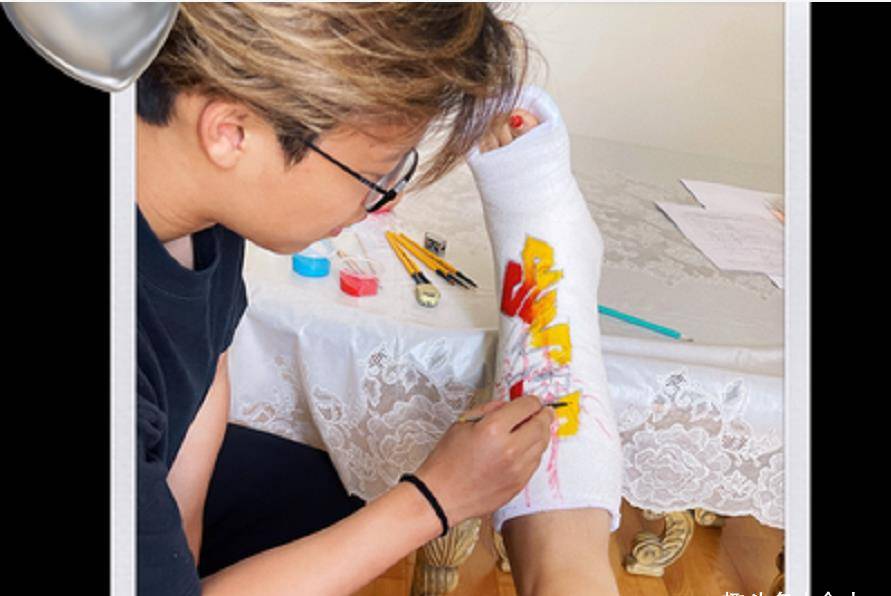 之后又在社交平台更新,腿伤似乎更加严重,还发布了几张儿子在自己脚上石膏作画的照片,说很感谢儿子的画,每次看到都感觉心里暖暖的。