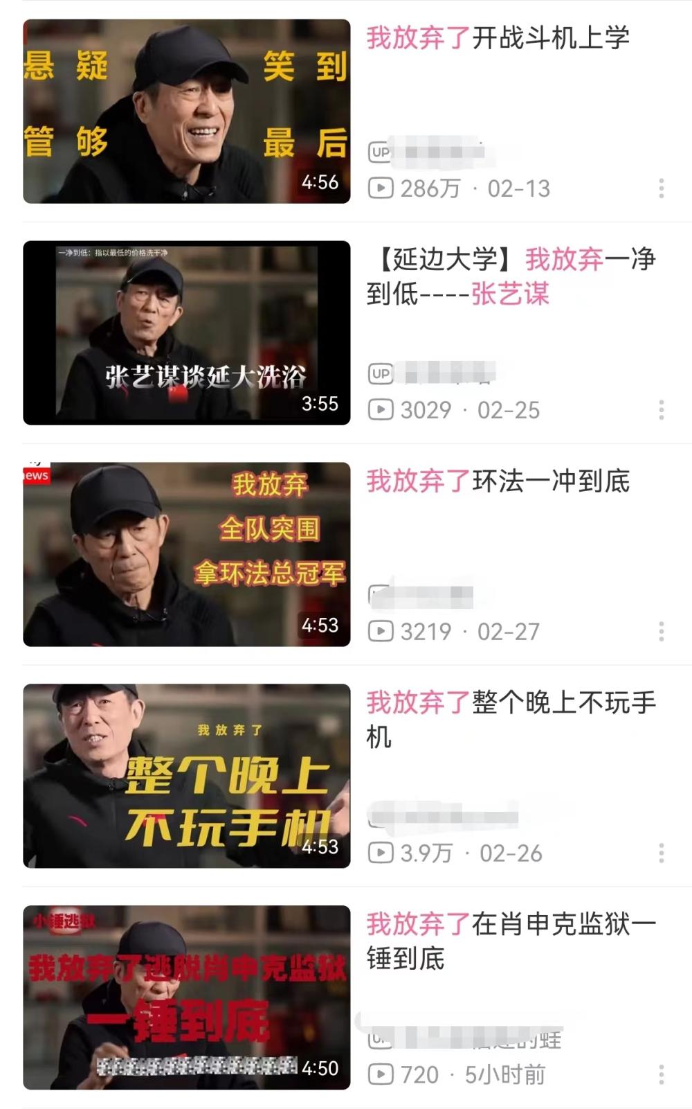 类似的二创视频最近比比皆是,这些视频大多以《我放弃了XX》为主题,通过替换张艺谋访谈原音频、重新配音剪辑的方式进行二次创作,有些还给封面的张艺谋P上其他图像,以其他人设来发表演说。